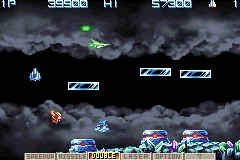 Après la courte introduction du jeu montrant les shoot Konami à travers le temps (Scramble, Salamander et bien sûr Gradius, mais pas de référence à Parodius, dommage), on comprend que ce Gradius Advance est un épisode exclusif GBA, et pas un portage d’une version précédente, ça fait donc plaisir d’avoir un shoot tout neuf et de nouveaux niveaux à nettoyer. C’est toujours Konami qui s’y colle, et on le sent car le système de jeu ne change pas d’un pixel : 2D avec scrolling horizontal, parfois vaguement vertical et système d’upgrade semblable aux anciens Gradius.